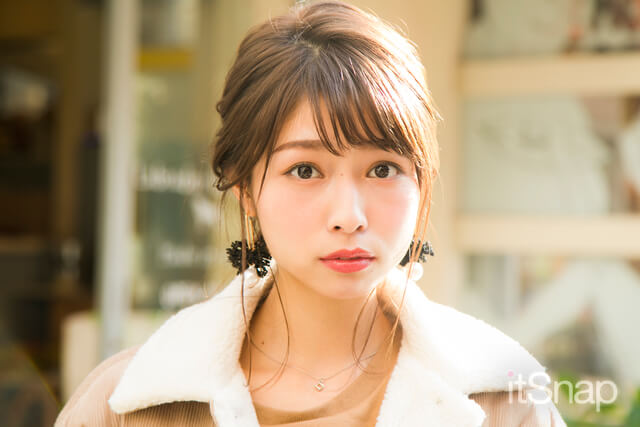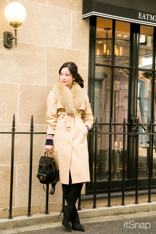 ボリュームたっぷりの襟ファーと前を閉めても可愛いラインのトレンチコートは、しっかりウエストをマークしてスタイルアップ! 1歩まちがうと生活感のあるお疲れヘアになってしまうローテールも、おくれ毛を少なめにしてウエットな質感を出せば女っぽさが加速します。