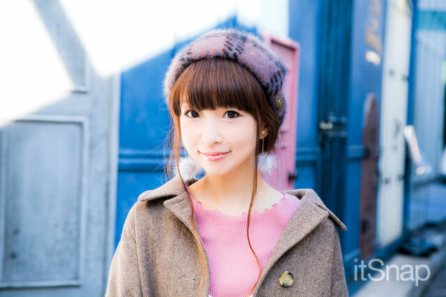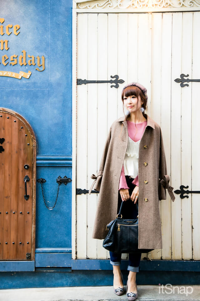 ピンクのカットソー&白キャミのレイヤードで甘め要素もプラスしつつ、肩掛けしたツイードのロングコートがちょっぴりマニッシュな雰囲気を演出しています。ゆれるおくれ毛で華を添えるキュートなまとめ髪には、ベレー帽がベストマッチ♡