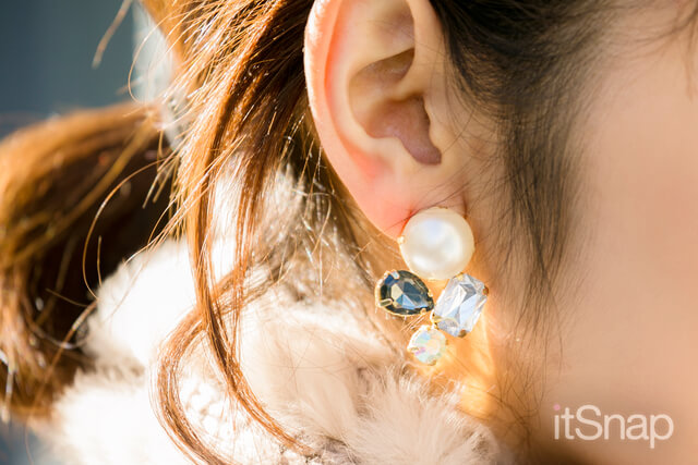 モノトーンコーデなので大ぶりのビジューで華やかに。