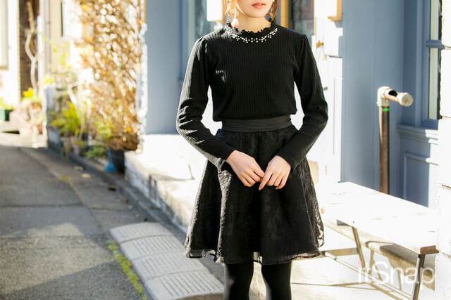 上半身は白っぽくまとめて愛され系に、ボトムは黒でまとめて引き締めているのもポイントです。