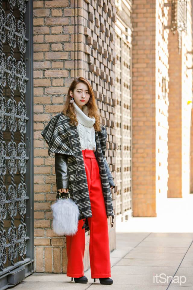 変形ドレープのチェック柄コートを主役に、鮮やかオレンジのパンツを合わせた派手コーデ。