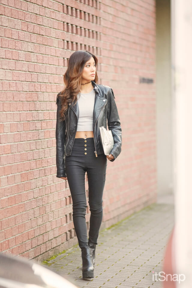 ライダースのインナーは薄着にして着ぶくれせずにスタイルアップ効果を発揮!お腹のチラ見せがコーデを格上げし、引き締めモノトーンスタイルに☆