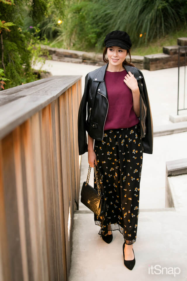 花柄ロングワンピースは、左の太もも部分が透けていてセクシー♡ライダースを一気に女性らしくしてくれるので、簡単に甘辛MIXコーデができちゃいます。スタッズ付きのエッジィなパンプスで強さを格上げ☆