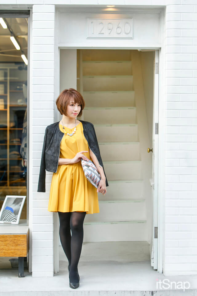 春色ワンピを主役に、それ以外はブラック中心の配色で甘辛MIXをイメージ。大人っぽさもプラスされ、カジュアルなライダースを取り入れつつも、上品な印象に♪大ぶりアクセも相性◎。