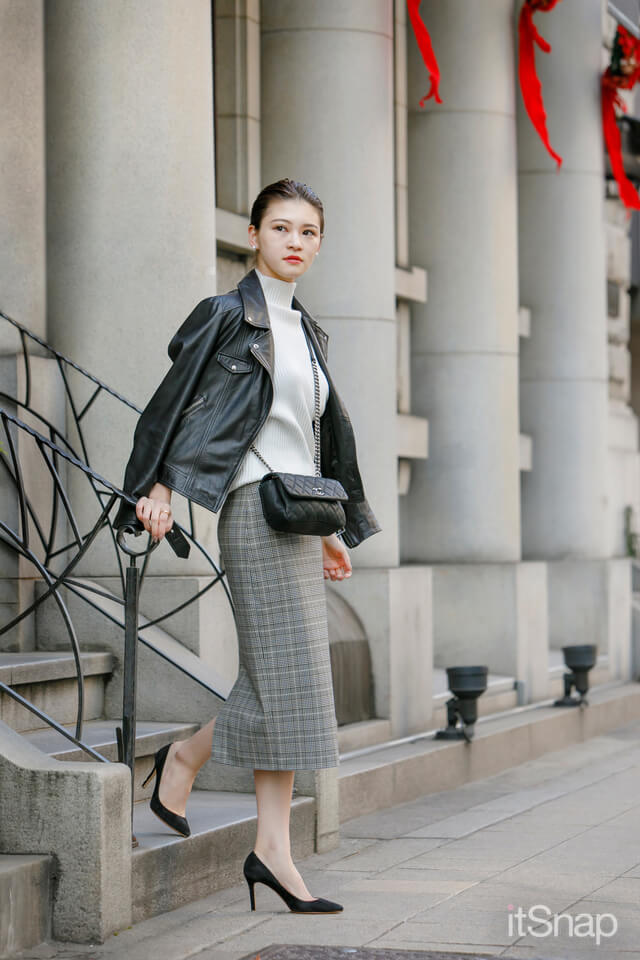 定番アイテムのライダースとトレンドのチェックペンシルスカートでシンプルカジュアルを演出。Iラインを意識して細見え効果も◎。靴やバッグもブラックで統一し、カッコイイモノトーンなスタイリングが完成☆