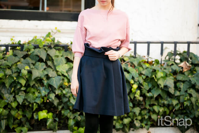 少しボリュームのある袖で、コートを脱いでも“可愛い”をキープ! クラシックなネイビーのスカートでピンクの甘さを調整。
