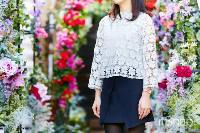 花柄も2018春のトレンドの1つ。パステルブルー×花柄の相乗効果で敵なし! の女の子らしさをアピール。肌がのぞくシアー感あるデザインで、コートを抜いだときのギャップも狙って♡