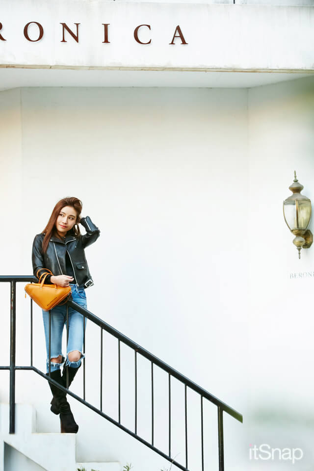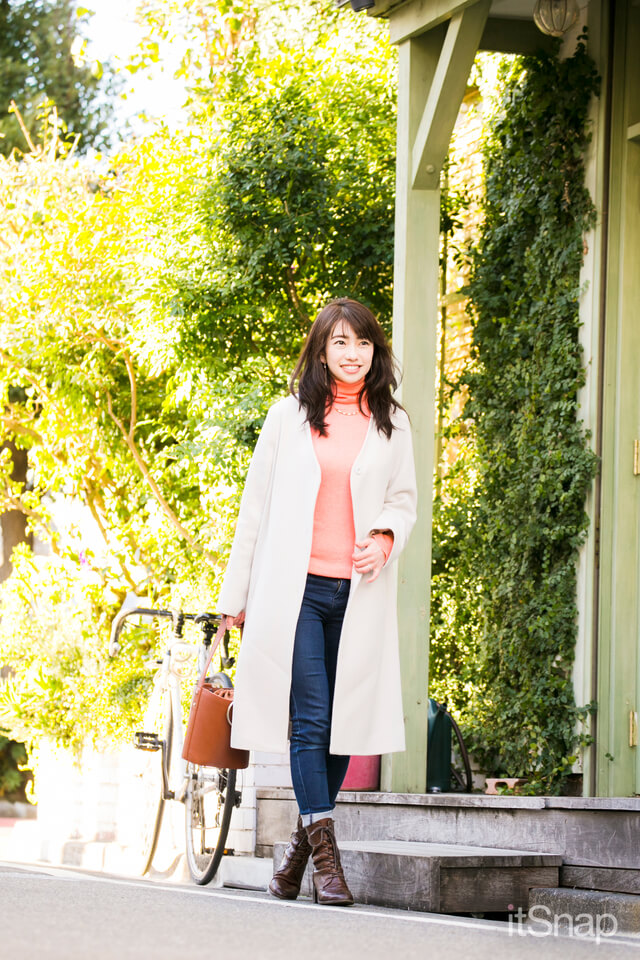 今年大注目の濃色デニムは、清潔感のある白コートとサーモンピンクのインナーでまとめると春らしく決まります。ダメージなしで濃いめカラーのスキニータイプは、きりっとコーデを引き締め、より脚をスラッと見せてくれる着まわし力抜群のアイテム。今季持っていて間違いなしの1本です。