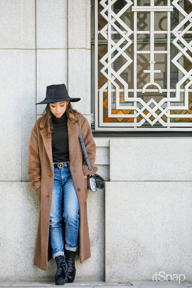 ストレートのボーイフレンドシルエットデニムは、楽ちんさと着まわしやすさを両立する便利アイテム。穿き込んだヴィンテージデニムみたいなユーズド感と裾のロールアップで、ロングアウターも軽快に着こなせます。トップスはフロントインしてベルトでポイントを作った方が、脚長効果がアップしてスタイル良く見せられますよ。