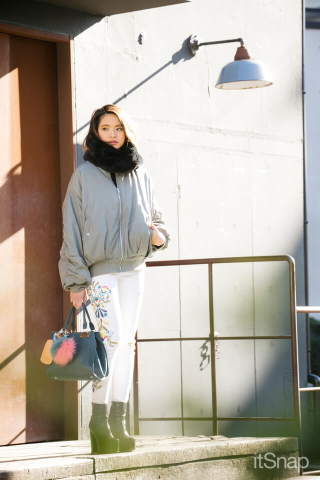今から春っぽい印象のコーディネートを目指すなら、ホワイトのスキニーデニムがぴったり!冬はボリューム感のあるMA-1&ファースヌードで防寒もしつつ、ホワイトデニムで明るさを出してバランスを取るのが◎。ブラウスやチュニックなどのフェミニンなトップスとも相性が良いので、春までしっかり活躍します。