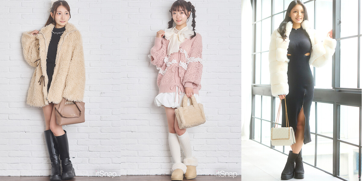 「冬になると着たくなるボア素材は、リボン付きデザインを選んで可愛さをキープ♪ このボアブルゾン(INGNI)、前を閉じてもリボンがアクセントになってくれるので一枚でサマになります♡ 中はパール付き黒ニットを仕込んで、シンプルなのにきちんと感を。ボトムはGRLのショートパンツで、脚がきれいに見えるバランスを意識しました! 厚底ロングブーツを合わせれば、目線が上がってスタイルよく見えます。あとは、仕上げにベージュバッグ(MACARONIC STYLE)を持って、優しげな雰囲気にまとめたんです。」