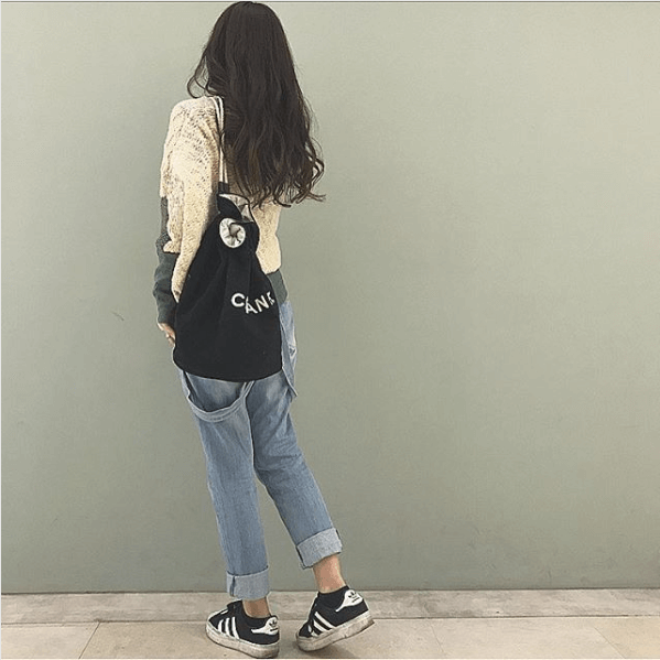 シャネルの巾着バッグとアディダスのスニーカー。2つの黒小物が主張しているカジュアルコーデ。
