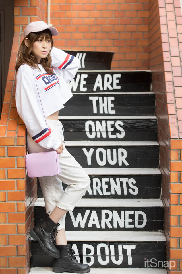 H&Mのロゴスウェットトップスに、ボトムもスウェット風のパンツでスポーティにまとめたら、小物でピンクを散りばめてガーリーライクに落とし込んで♡ 淡めピンクの絶妙なアクセントで、みんなの視線を独り占めに!