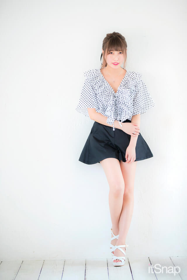 フリルデザインがガーリーなドット柄ブラウスは、モノトーンで色味を抑えて大人っぽく。フレアシルエットのショートパンツをウエストインすれば脚を細く長く見せてくれます。大胆な脚見せコーデの足元は、ホワイトサンダルを合わせてより爽やかに♪