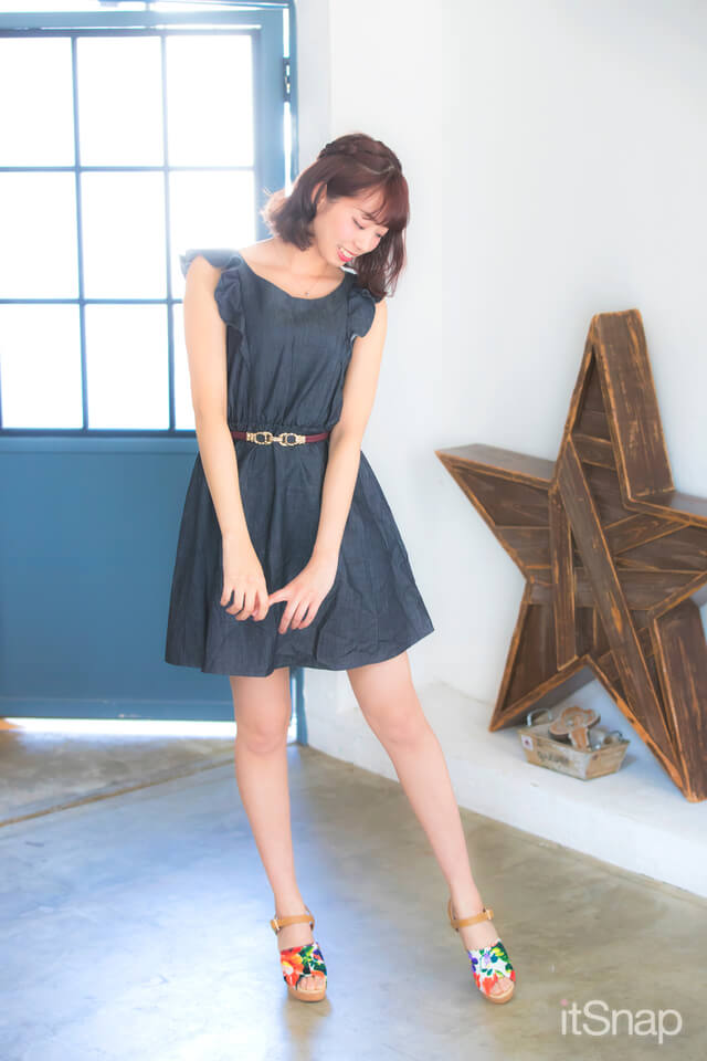 袖のフリル使いがキュートなデニムワンピは、ウエストを細ベルトでマークしてスタイルアップを意識。ワンピ1枚のシンプルコーデには、夏気分満点のトロピカル柄サンダルで、遊び心をプラスして☆