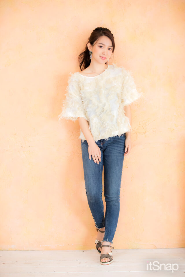 ふわふわフェザーの甘めトップスには、キレイなシルエットのスキニーデニムが相性抜群! 足元はナチュラルなサンダルで抜け感をつくり、より軽やかに仕上げるのが◎。