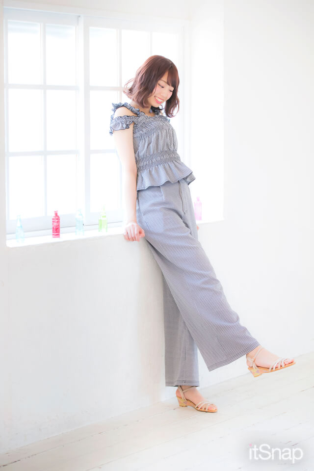 リラックスして着られるギンガムチェックのセットアップは、オフショルよりも取り入れやすい肩あきフリルで今っぽい表情に。華奢ストラップのサンダルで、女らしさを盛り上げて♡