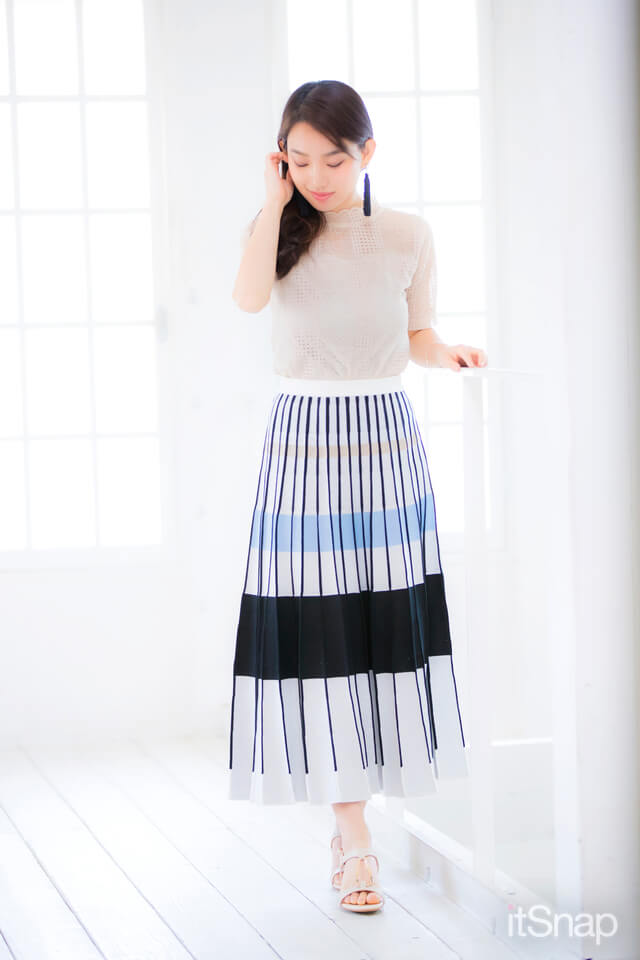 ストライプ×ボーダー柄のスカートがインパクト大! トップスと足元はベージュで合わせて上品に仕上げています。レースの刺しゅうが女性らしい大胆過ぎない透け見せトップスは、男性ウケもばっちりです♡