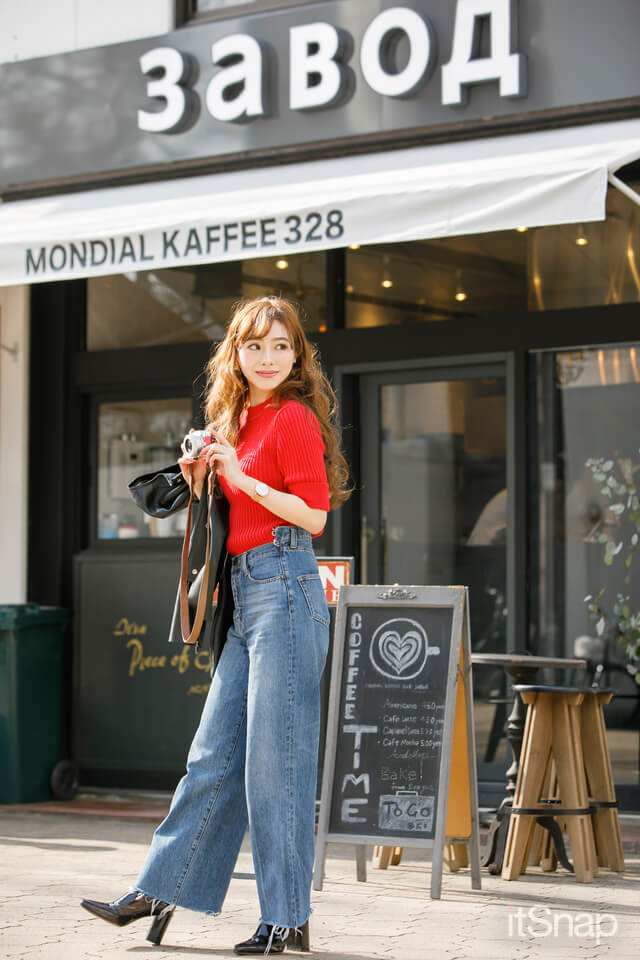 デニムに赤のアイテムを合わせることで、周りと差をつけるキュートな着こなしに♡ ほどよくカジュアル&ほどよく女らしいコーデになるので、休日デートにもぴったりですよ♪ エナメル素材のちょっぴり辛口なブーツを合わせて、コーデを洗練された印象に格上げして!