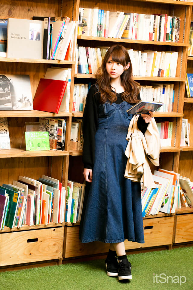 めずらしいデニムのワンピースに視線が集中すること間違いなし! Vネックのインナーをレイヤードして、スッキリとした着こなしに♪ あえて、スポーティーなスニーカーを合わせることで、こなれ感を出せるので◎。