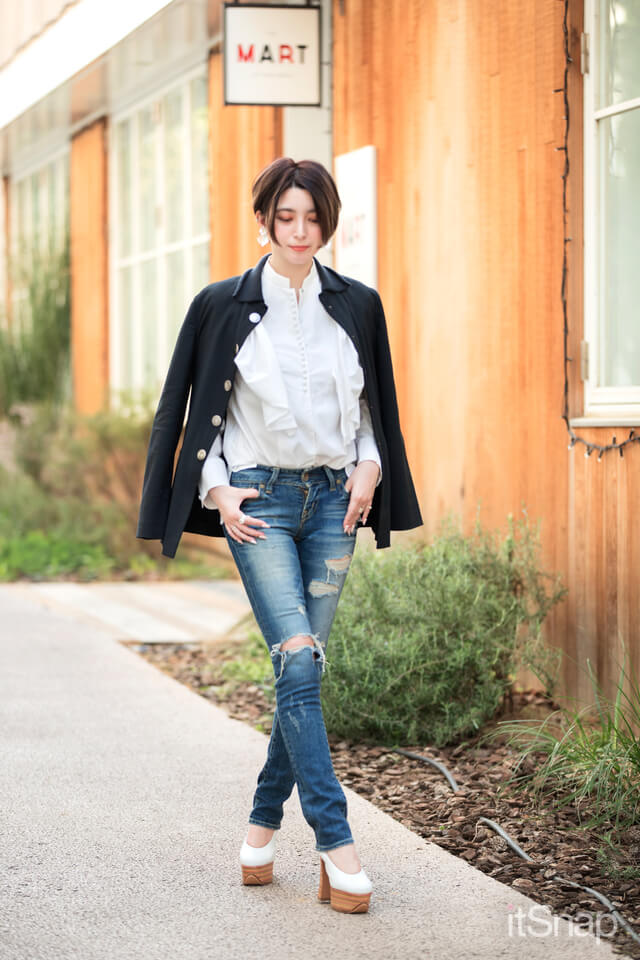 ボリュームのある甘めフリルシャツに、ダメージの入ったスキニーのバランスが絶妙! そこにテーラードジャケットを合わせれば、デニムでもシックな着こなしになります♡ 足元は、カラフルなヒールが可愛い厚底パンプスで、遊び心も忘れずに♪