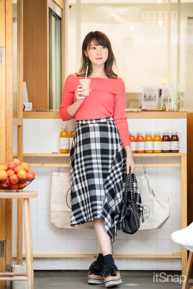 一点投入で華やかな印象に見せてくれる派手めカラーも、オフショルで取り入れれば上品な印象になりますよ♡ ボトムスは、大きめのチェック柄にアシメントリーのデザインが目を惹くスカートをチョイスしてトレンド感を上乗せして!