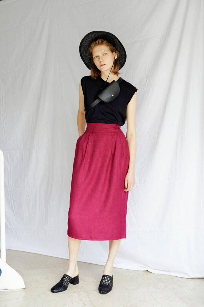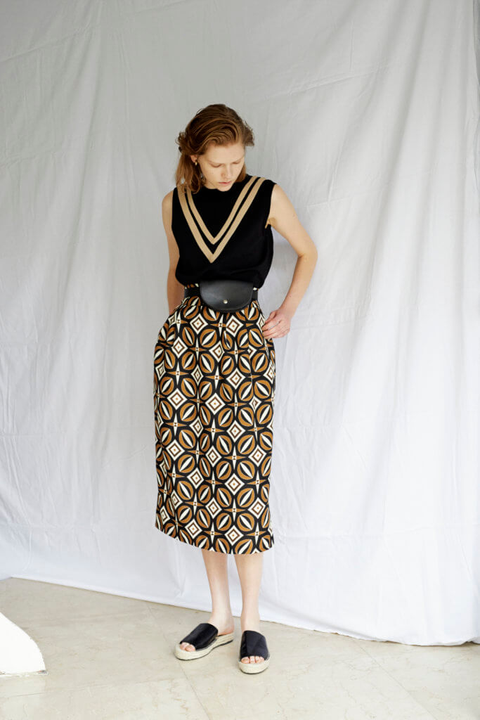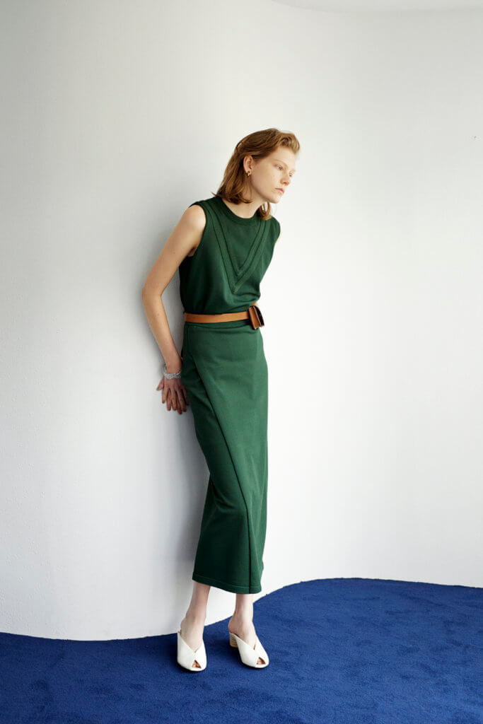 今までのコレクションには無かったコクーンシルエットのスカートは、女性らしい上品な印象に。
