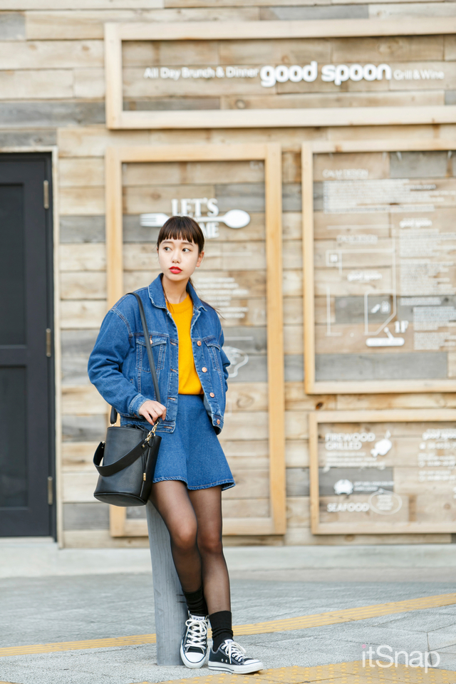 トップスに春らしい明るいイエローを投入したのが新鮮!ブルー×イエローの配色が春気分を盛り上げます。