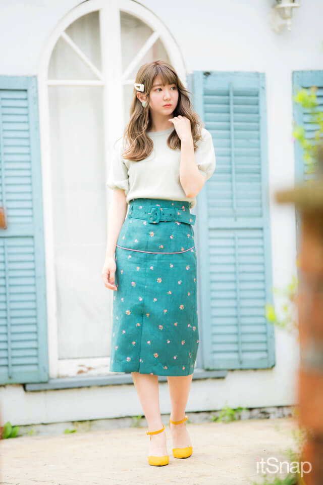 グリーン系をベースに、足元はマスタードカラーを取り入れ、レトロな雰囲気が可愛いこちらのコーデ。トップスのソデがパフスリーブになっていたり、ボトムのウエストマーク&ミモレ丈などフェミニンなディティールも◎ コーデに合わせてアクセもカラーをグリーン系で合わせれば、こなれ感も加速!