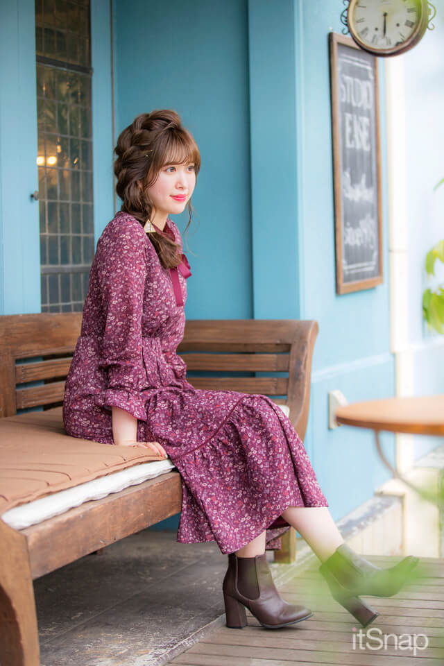 レディライクな小花柄ワンピは深みのあるボルドーの色味がおしゃれ。クラシカルなシルエットや胸元のリボンなど、細かいところまでかわいいポイントがたくさん♡ ショートブーツと合わせて甘くなりすぎないようカジュアルに着こなして♡