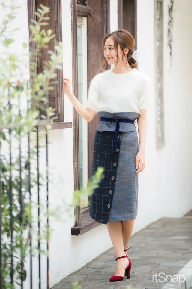 個性的なデザインのコルセット付きチェックスカートが主役のコーデ。トップスには、コンパクトな白ニットを合わせ、ボトムを引き立たせてバランスよく着こなして。足元とイヤリングに秋色ボルドーを仕込ませて女性らしさもキープ♡