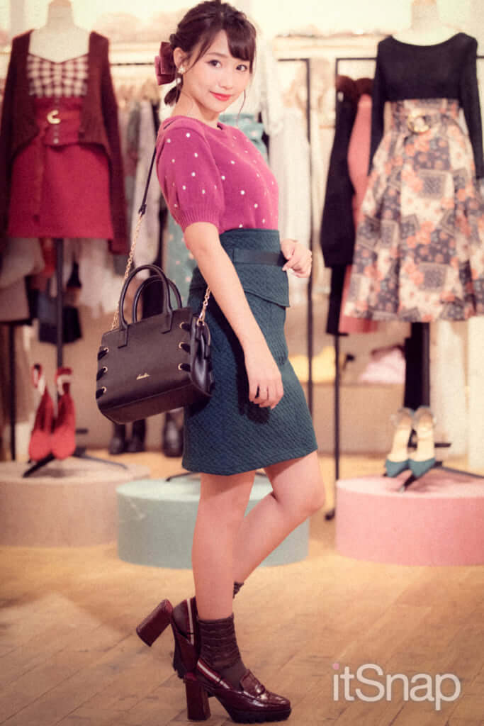 「ピンクもドット柄も大好きなので、ニットを主役に秋らしいくすみカラーでコーディネート。ちょっとムラサキっぽい深みのあるピンクってトレンドですよね♪ こっくりしたグリーンもこの秋の注目カラー。このスカートはコルセットが付いているので、ウエストのシルエットがとってもキレイ♡ 足元はヒール高めのローファーとソックスで、全身をバランスよく見せました!」