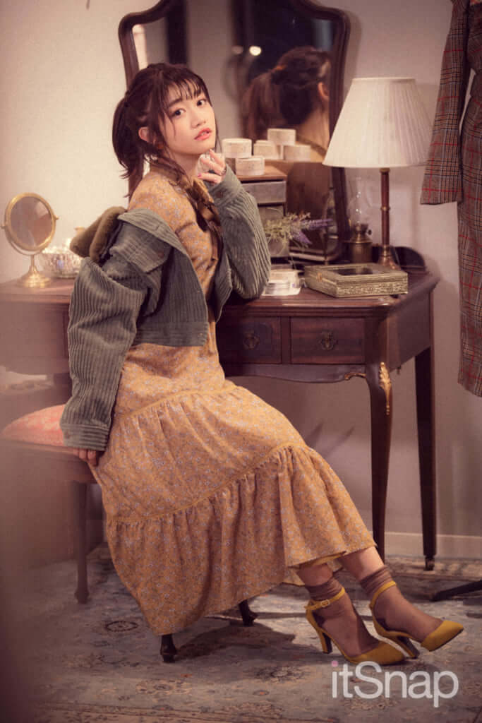 「ひと目ボレしたコーデュロイジャケットに、女の子らしい花柄ワンピを合わせてみました。カーキもマスタードもどちらも大好きなカラー♡ ジャケットは肩を落としてちょっとルーズに着たのがポイントです! ワンピの色に合わせて足元もマスタード。ブーツか迷ったんですが、首元に重みがあるので、パンプスで抜け感を出しました。シアーなソックスで秋らしさをプラス!」