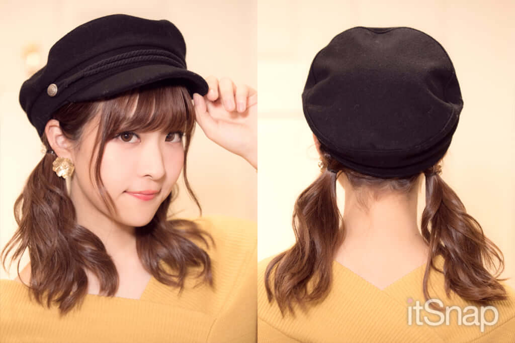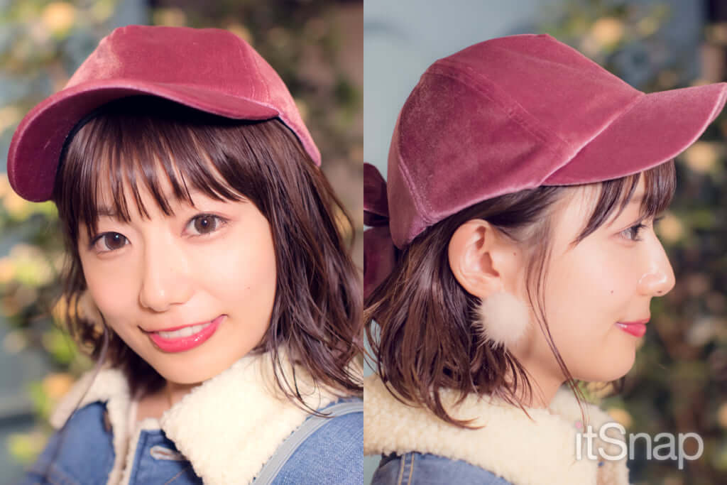 「秋冬はウェットな質感のヘアがお気に入り! ゆる巻きにしたミディアムヘアを耳かけにして、キャップでアレンジしてみました。髪を巻いたあとにナチュ髪バターをたっぷりつけると、それだけで今年らしいナチュアレンジが完成します♪ キャップアレンジは前髪が大事なので、かぶったあとにもつけて束感をアップさせました!」