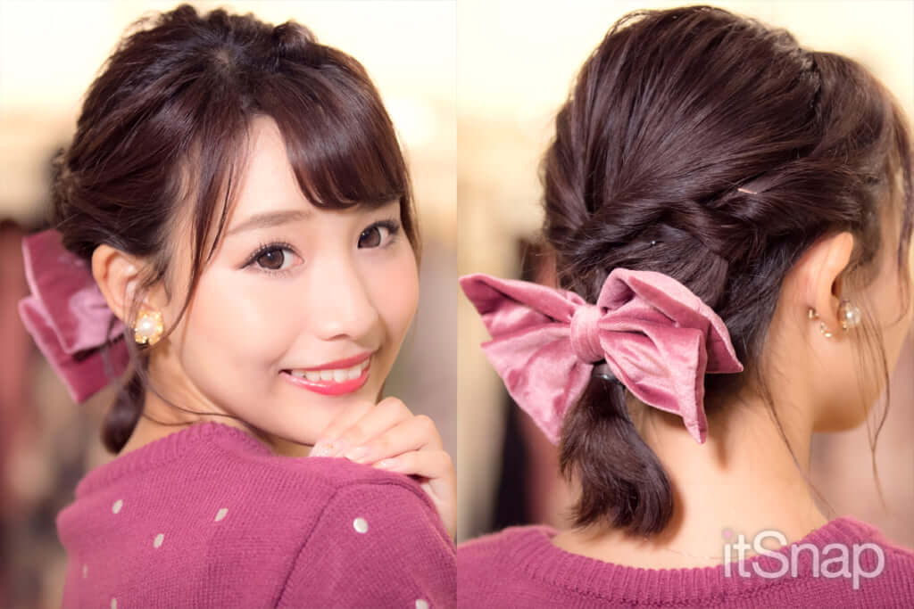 「低めのくるりんぱにツイストをプラスして、クラシカルな印象にまとめました。髪を巻いたあとに全体にナチュ髪バターをつけてからアレンジすると、細かく引き出したときにふんわりとしたボリューム感が出るんです。おくれ毛や前髪にもつけて今年らしい束感も演出! ニットの色と合わせたベロアリボンもポイントです♡」
