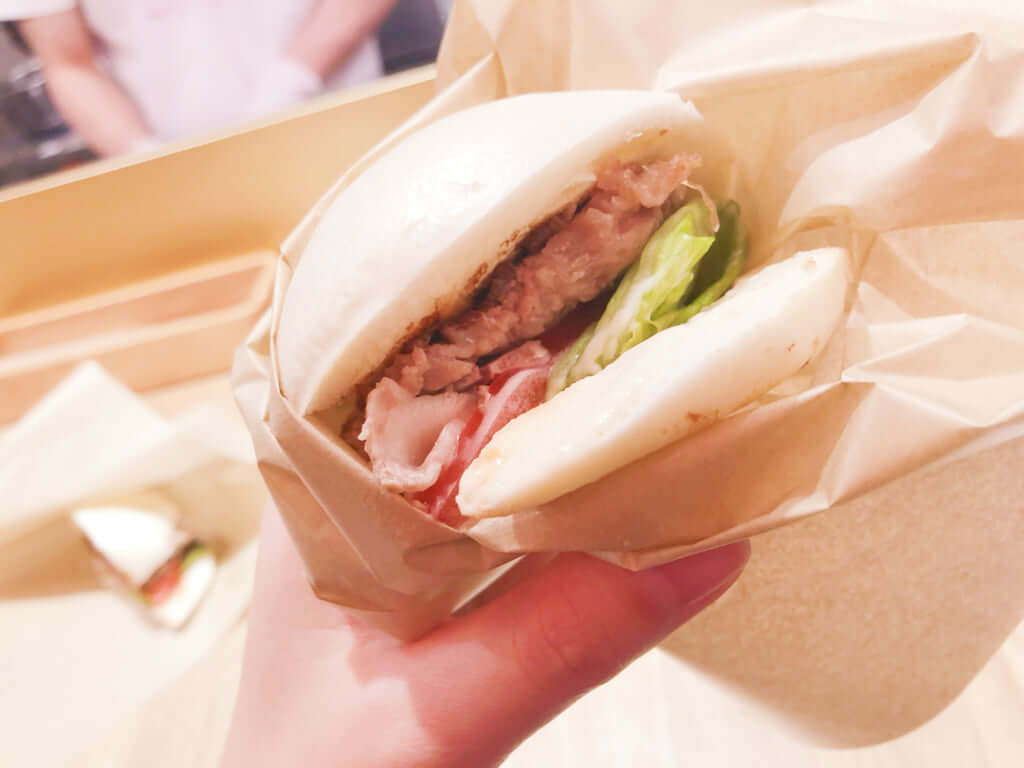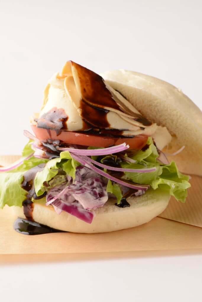 「湯葉チャーシューバーガー」は、湯葉を加工した大豆チャーシューを挟んだあっさり目の一品。大豆チャーシューは鶏肉のような食感で、お肉が苦手だけど食べごたえのあるものが食べたい人にオススメです。