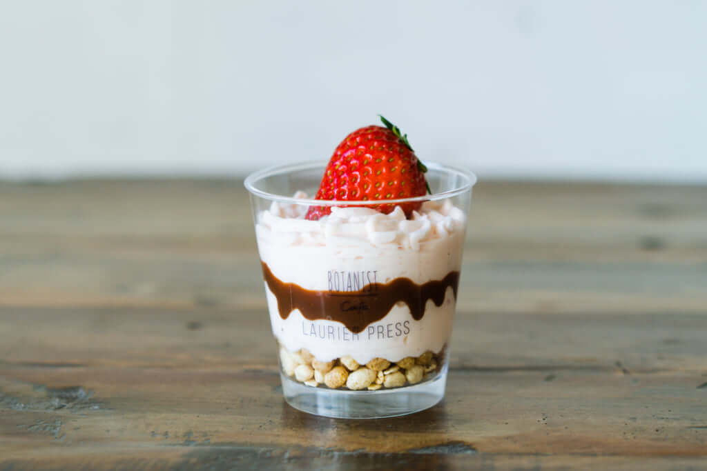 春限定メニューとあわせてバレンタイン限定メニューにも注目! こちらは、トッピングのいちごがポイントの「レアチーズカップ」。酸味のある濃厚チーズクリームに、たっぷりといちごを練り込んだスイーツです。手のひらサイズでも大満足のこちら、グラノーラのサクサク感や、チョコレートソースのアクセントを楽しんで♡ 撮影するときは手に持って断面を撮るのがオススメです!