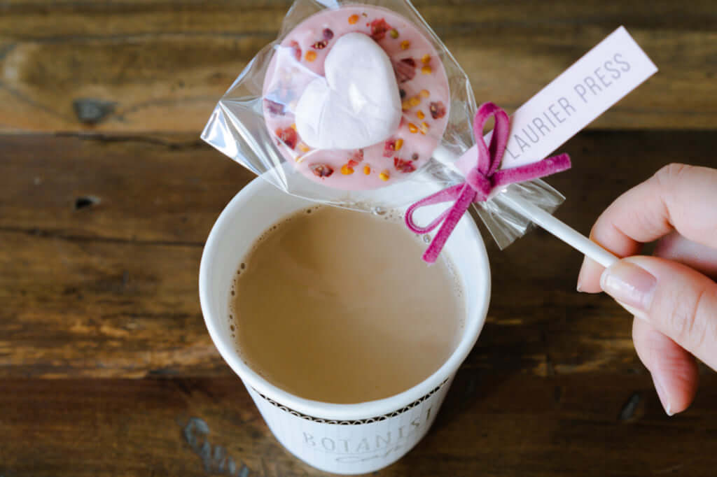 こちらは、ホワイト・いちごから選べるホットドリンク「ロリポップチョコラテ」。カフェオレにチョコレートを溶かすと、ハート型のマシュマロが浮かんでくるムービージェニックなメニューです。ヘーゼルナッツシロップの風味豊かなカフェオレにほっこり♡ バレンタインにぴったりのホットドリンクです。