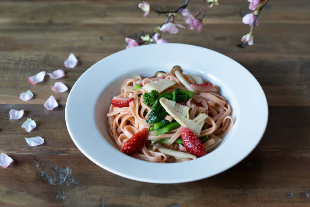 フードメニューも春満開! こちらは、菜の花などの旬野菜といちごをトマト麺と絡めた「春野菜のブルームパスタ」。トマトを練り込んだ桜色のパスタに、春を感じる菜の花や筍、きのこをたっぷり絡めてほおばるべし!酸味のあるイチゴと、隠し味のバルサミコ酢が相性抜群☆ ガーリックが効いたオイルベースでさっぱり食べられます。