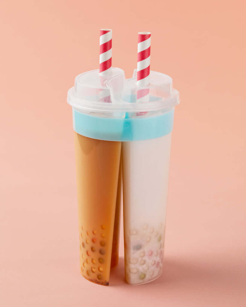 トロピカルな甘みが広がるココナッツジュースと、アールグレイを使った香りも華やかなミルクティーのカップが一つにドッキング。ピンクやイエローのカラフルなタピオカがとってもキュートですね♡ タピオカのもちもちとした食感を存分に堪能できるドリンクです。