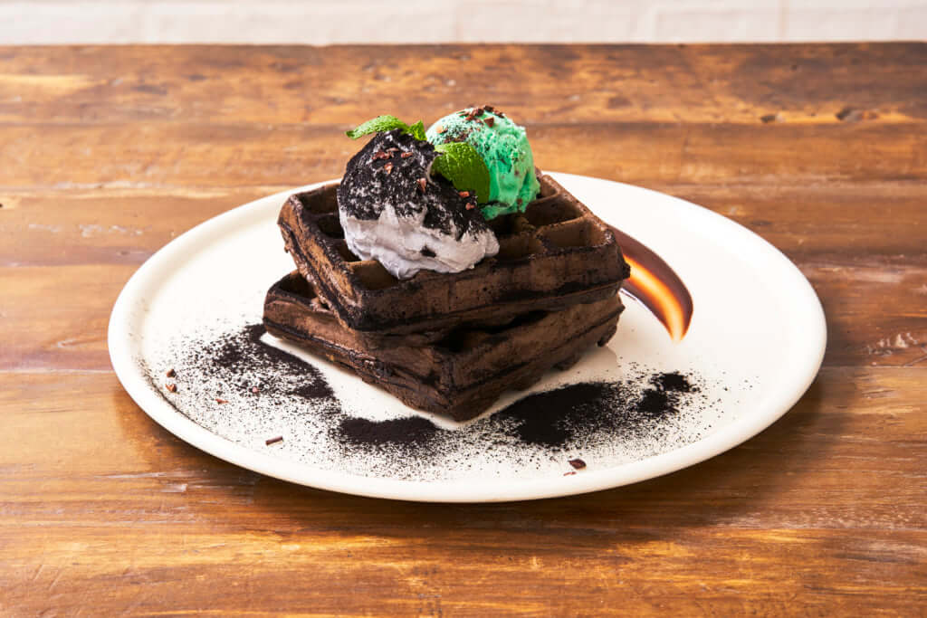 「CHOCOLATE MINT ICECREAM ON CHARCOAL WAFFLES(チャコールワッフル×チョコミントアイス)」 1,200円(税込)
