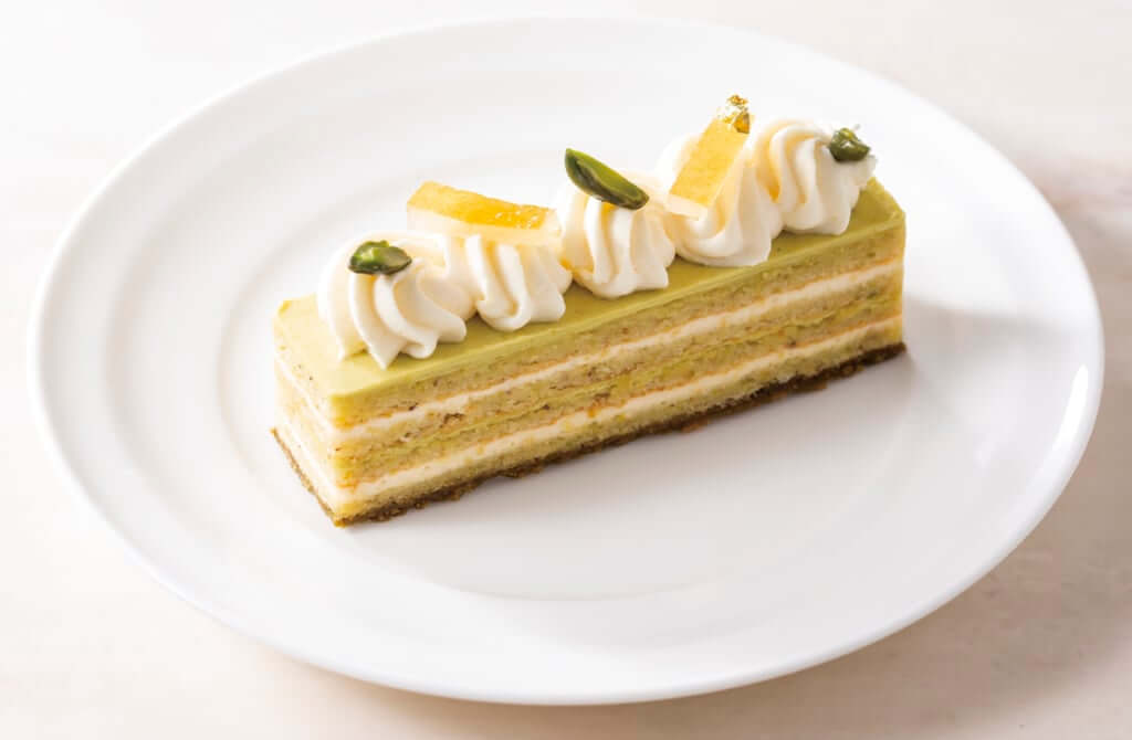 「シトロン ピスターシュ」は、レモンのさわやかな酸味とピスタチオの濃厚な味わいが重なりあった、初夏らしい爽やかなケーキです。レモンの酸味と苦み、ピスタチオ風味のクランチは相性抜群!