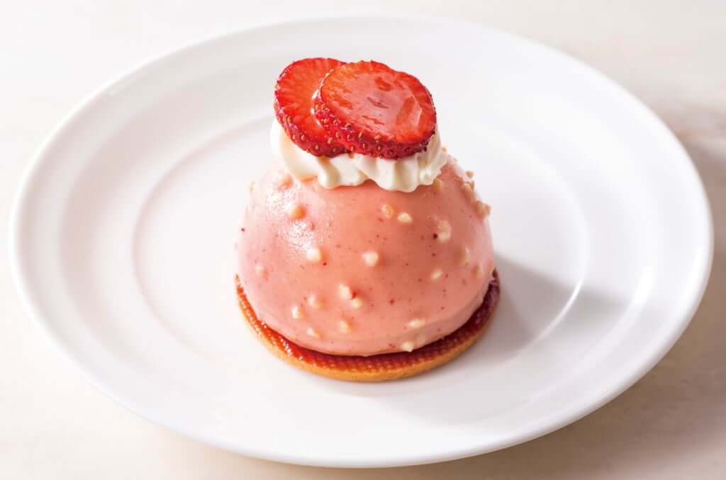 なめらかな苺クリームと酸味のある苺ジュレを、メープル風味のマスカルポーネムースでやさしく包み込みこんだ一品♡ はじめに苺の甘酸っぱい味わいが口に広がり、後からメープルのやさしい甘さが全体を包み込んでくれるような深い味わいのケーキです。