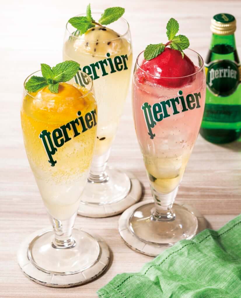 上質な国産素材のシロップを南フランスの炭酸入りナチュラルミネラルウォーター「ペリエ」で割り、ジューシーなソルベを添えたコラボドリンク♪ まずは、すっきりさわやかな味わいを楽しみ、ソルベが溶けてきたらペリエとミックス。味わいの変化を楽しめる、青山本店「BLUE BRICK LOUNGE」だけで味わえる、特別なペリエドリンク!