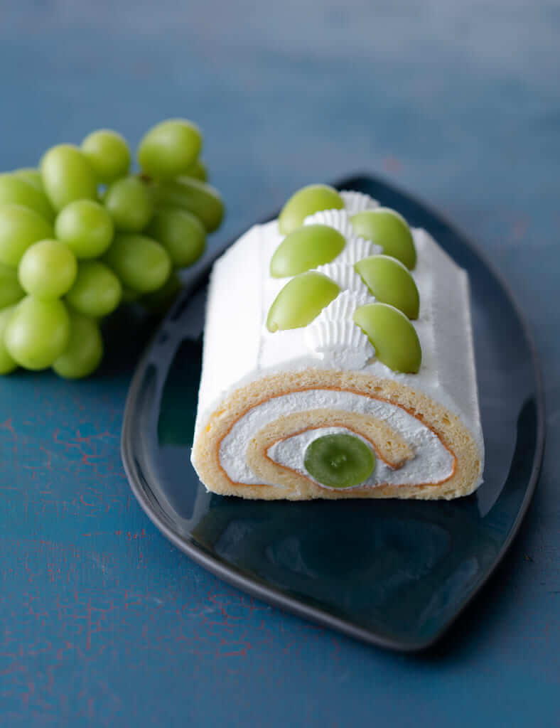 みずみずしいシャインマスカットとヨーグルトを加えた爽やかな味わいのチーズクリームを、しっとりとしたシフォン生地で巻き上げたロールケーキ。かわいい見た目で、おみやげにもぴったり♡ ※ケーキサイズは14cm