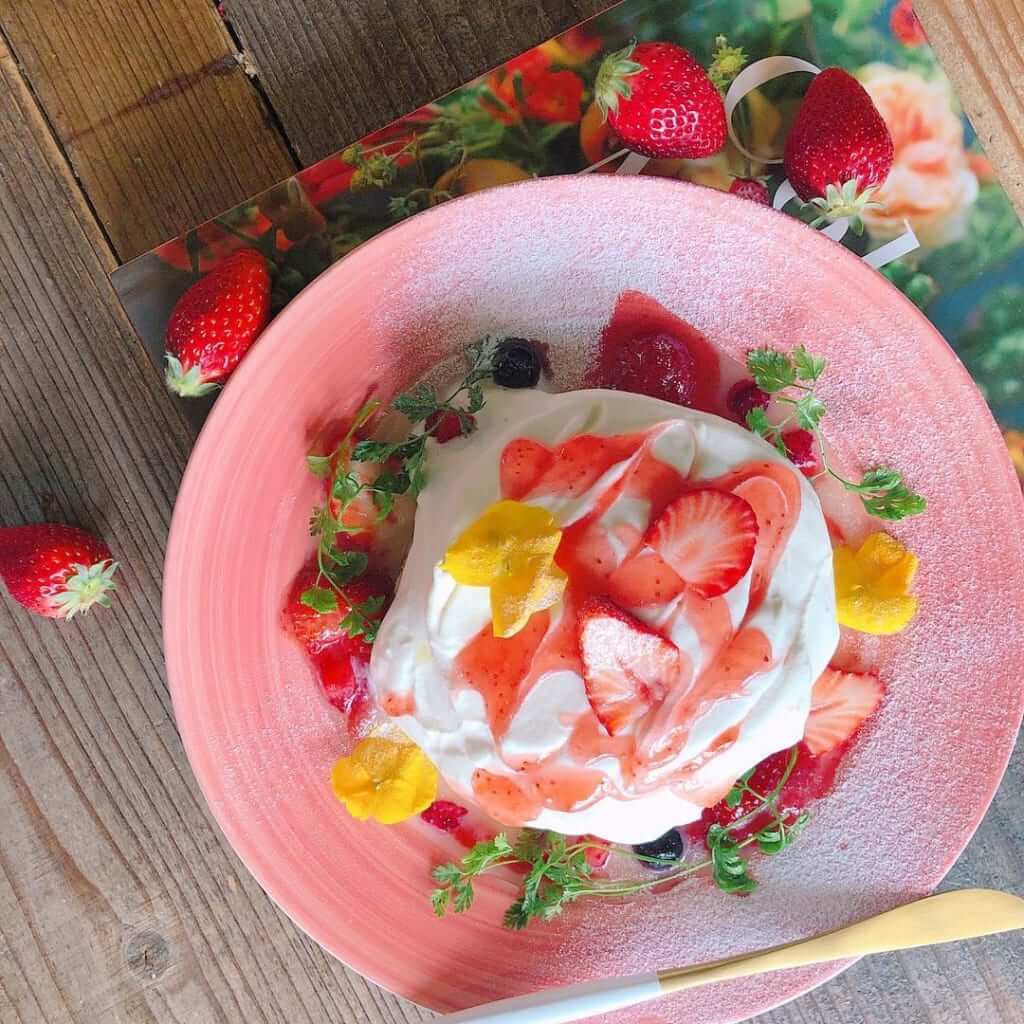 口の中でしゅわ〜っととろける、卵感が強めのとろとろパンケーキ。生クリームは甘さ控えめであっさりとしていて、飽きずにぺろっと食べられちゃいます♡ パンケーキを囲っている苺のチョコソースも味のアクセントになって美味しさ満点メニュー!