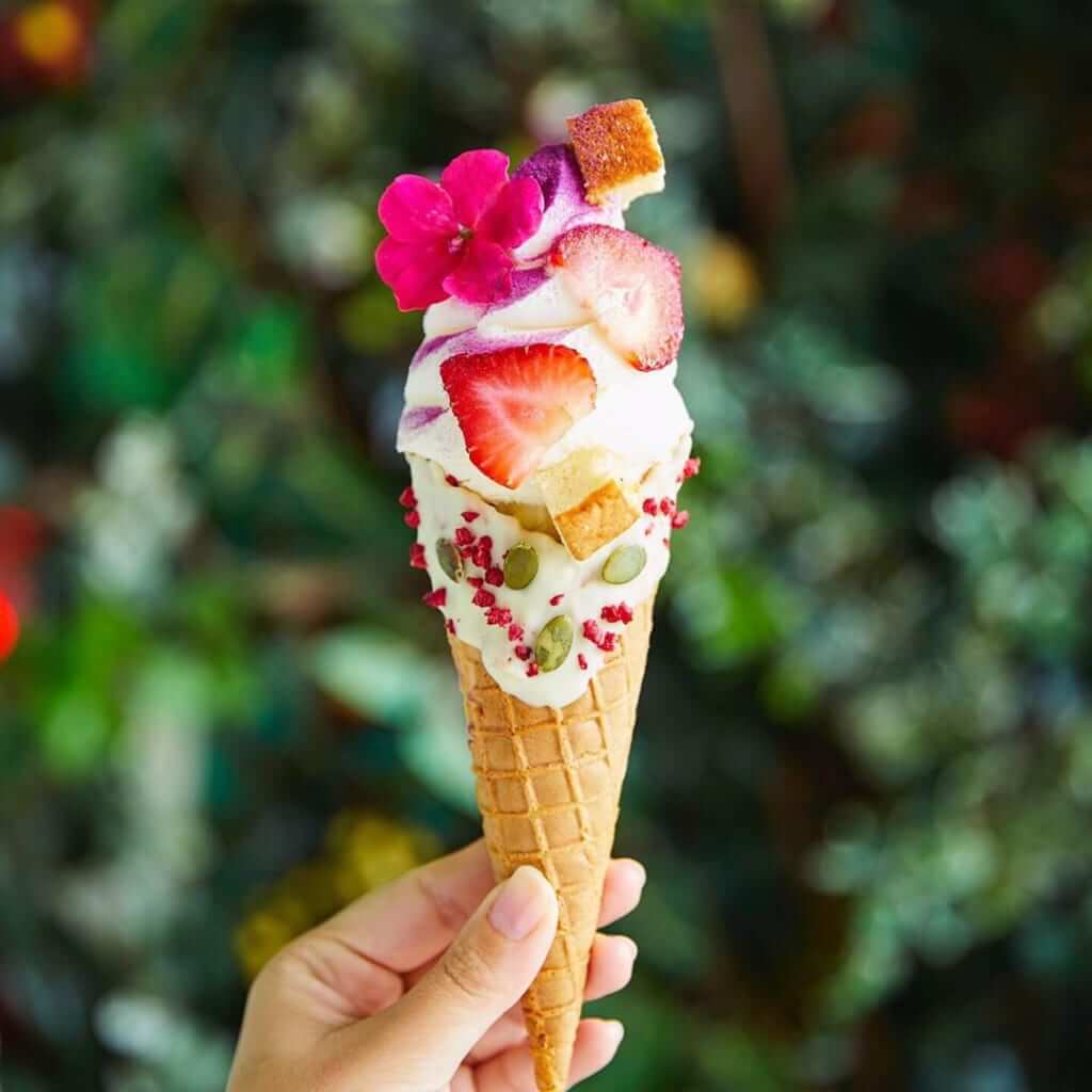 花束のようなビジュアルでおとぎ話に出てきそうなソフトクリーム♡ いろいろなデコレーションで彩られているソフトクリームの味はさっぱりとしていて最後まで美味しく食べられます。ワッフルコーンにはチョコレートがコーディングされていて、コーンまで美味しいのも嬉しいポイント!