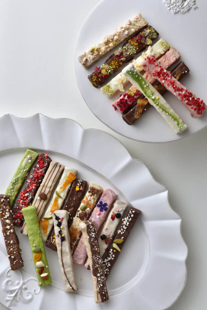 バトンの形をした「Batonnets de Rusk(パトネデラスク)」は、バータイプで食べやすいのが魅力。定番のミルクチョコやホワイトチョコ、ストロベリーチョコのほかに、コーヒー、抹茶、ビターチョコやミルクティなど、バラエティ豊かな味が揃っています。
