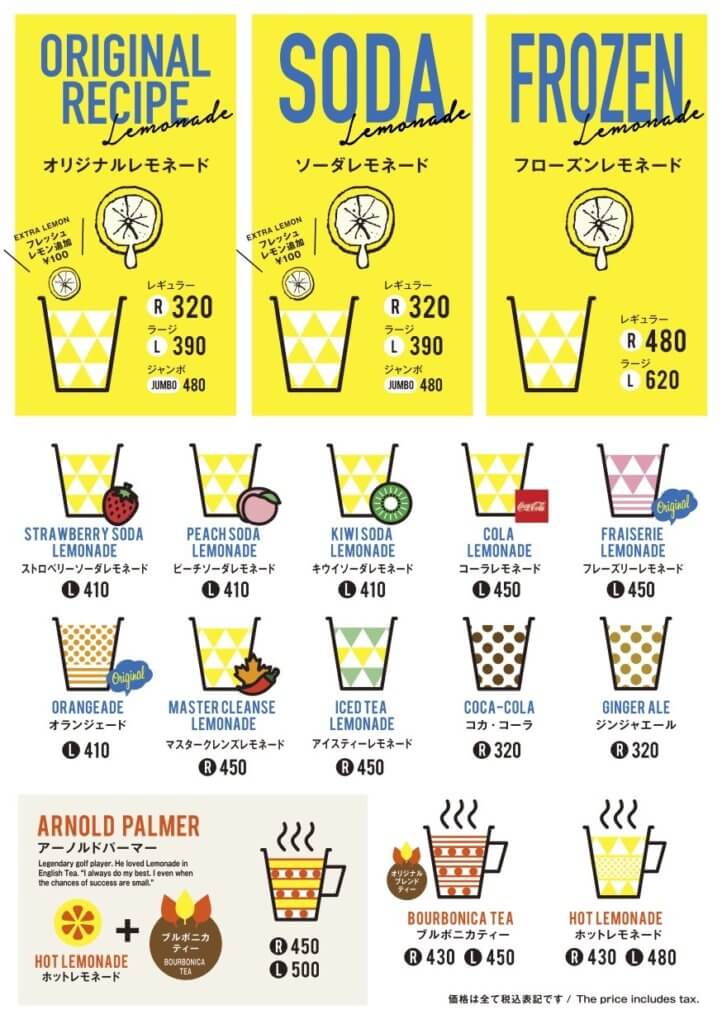 おすすめメニューは、オリジナルレモネード320円(税別)、ソーダレモネード320円(税別)、ストロベリーソーダレモネード410円(税別)、マスタークレンズレモネード450円(税別)