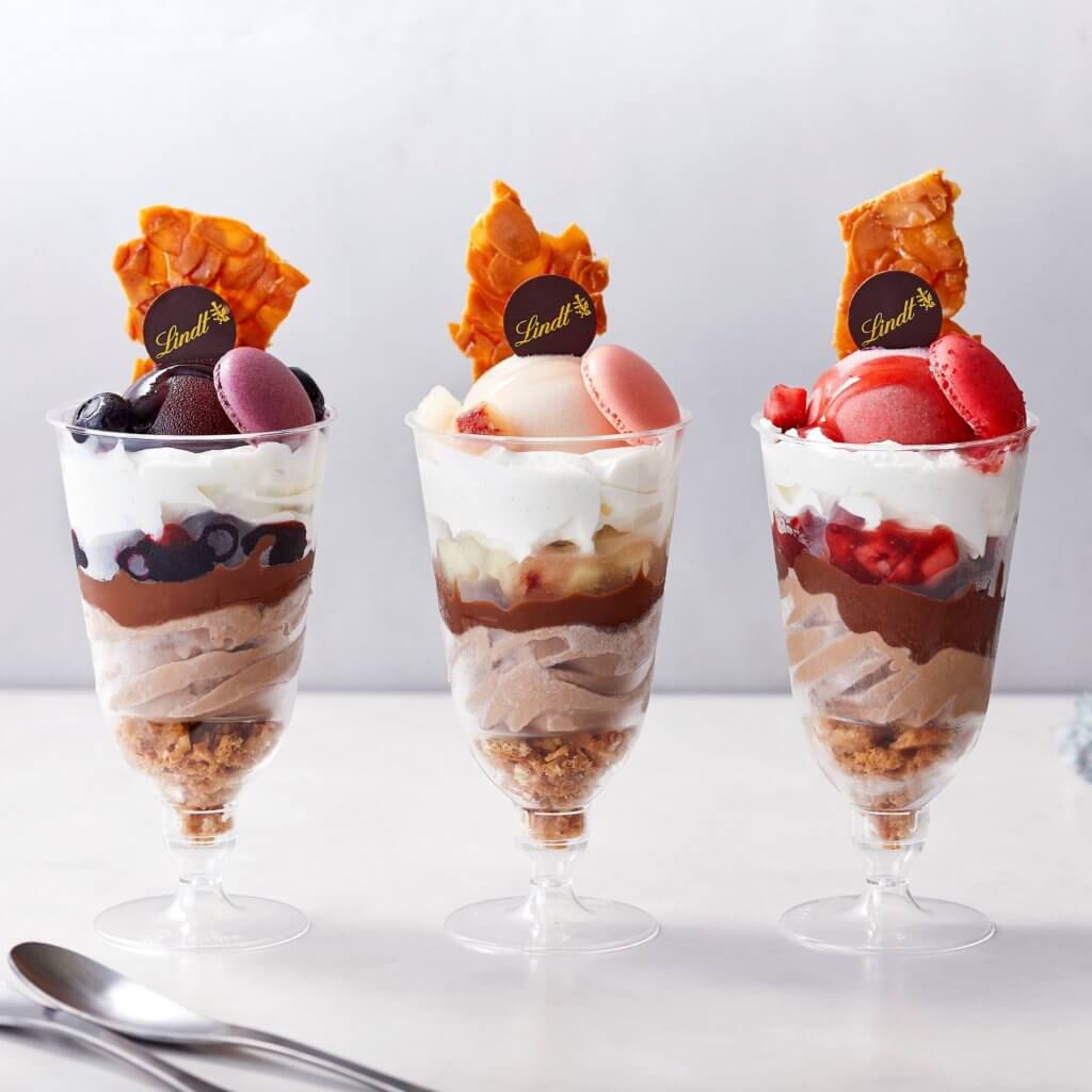 新メニューのラインアップは、冷たくて夏にぴったりな「リンツ ホワイトチョコレート アイスドリンク」、ボリューム満点の「リンツ ショコラパフェ」、そしてガナッシュとフルーツピューレを組み合わせたマカロン「リンツ デリース」の3種。